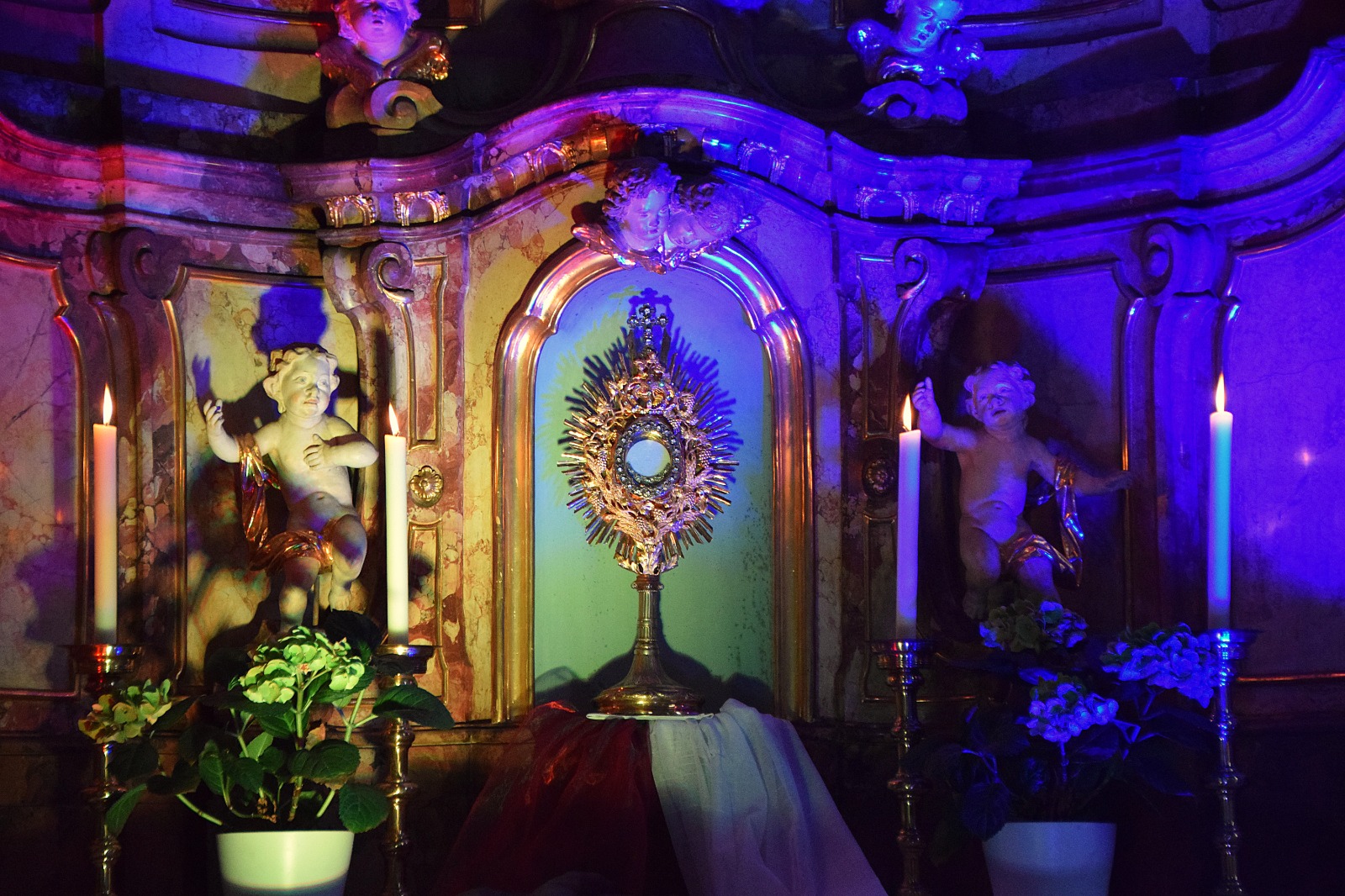 Nach der Wallfahrtsmesse begann der eigentliche Abend der Hoffnung. Unschwer zu erkennen war beim Betreten der Kirche der farblich beleuchtete Altar, was auch einen besonderen Grund hatte: Im Mittelpunkt stand Jesus Christus, welcher im gewandelten Brot (Hostie) in der Monstranz auf dem Altar ausgesetzt war, um so seine Präsenz darzustellen. In wechselnder Besetzung wurden während des gesamten Abends modere Lobpreislieder gespielt sowie Meditationsimpulse aus dem Sonnengesang vom Heiligen Franz von Assisi vorgetragen, welche bei den Besuchern sehr gut ankamen. Dazwischen war auch Zeit für das persönliche Gebet in der Stille. Während der gesamten Zeit der eucharistischen Anbetung konnte man in der Bank knieend oder sitzend verweilen oder auch im Altarraum vor dem Allerheiligsten knien, eine Kerze anzünden oder eine Bibelstelle ziehen.