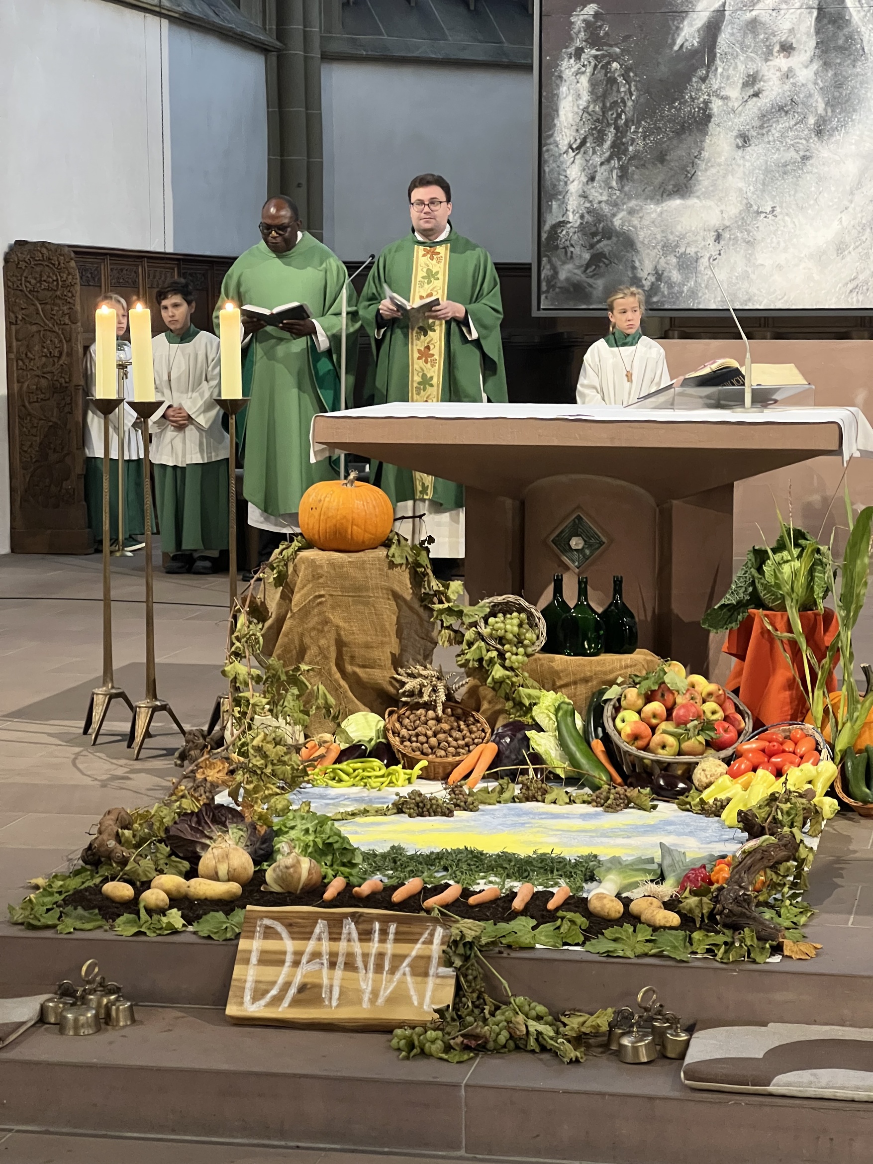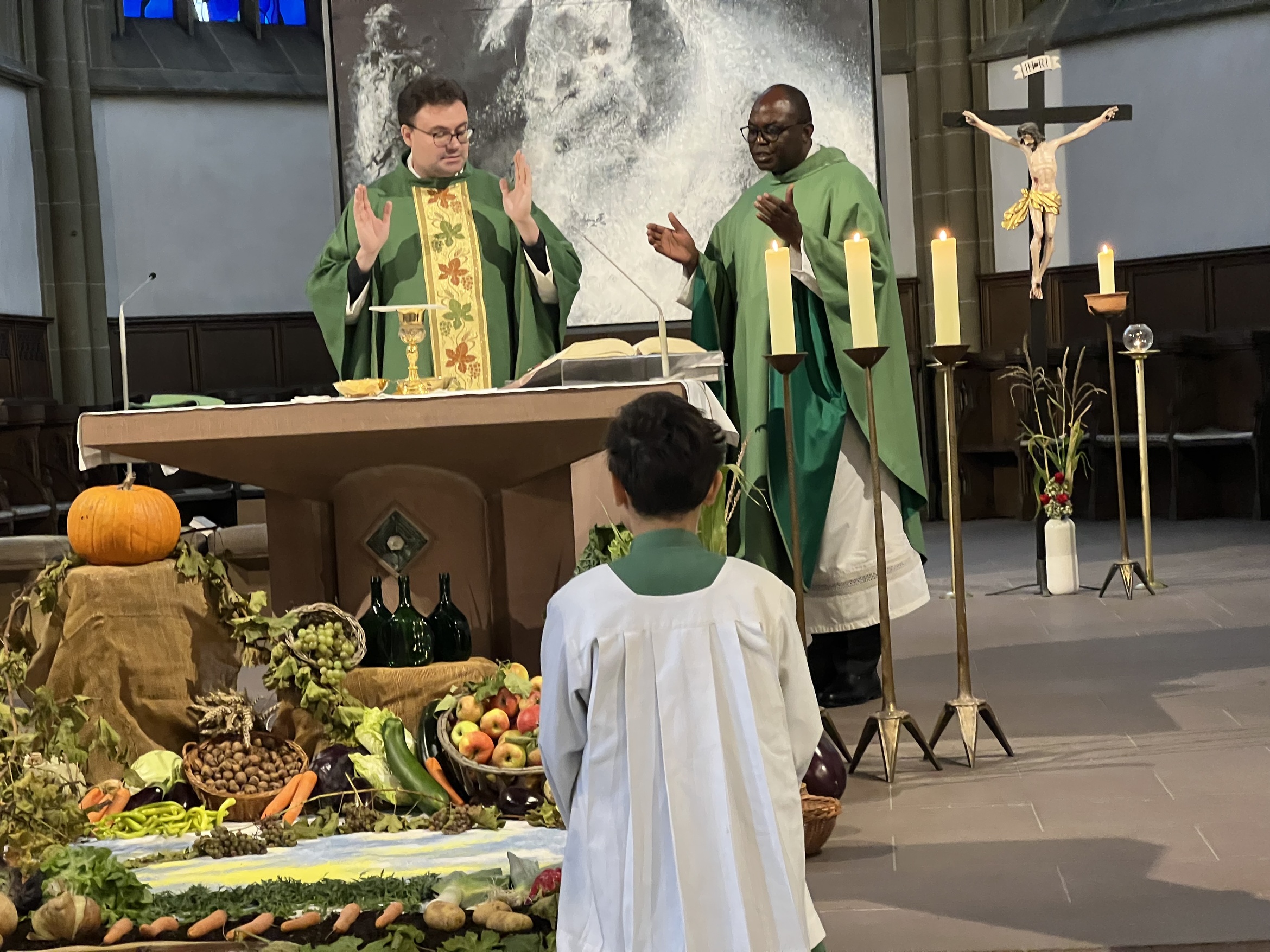 In seiner erfrischenden Predigt machte Pfarrer Dr. Fungula deutlich, wie wichtig das Danken ist, nicht nur an Erntedank mit dem schönen Erntedankaltar. Vor allem sei es wichtig, dass das Danken von ganzem Herzen komme. Jedes Jahr schenke Gott uns auf‘s Neue viele Gaben und Fähigkeiten und vor allem das Leben. Im Danken spüren wir, was wir alles haben und können. So können wir neu aufstehen mit allen neuen Herausforderungen. So sei er dankbar, dass er nun im Pastoralen Raum Kitzingen seelsorglich wirken könne und freue sich auf die Begegnung mit den Menschen. Die Gemeinde ermutigte Dr. Fungula im Miteinander alle anstehenden Probleme und Fragen anzugehen.