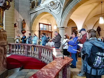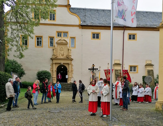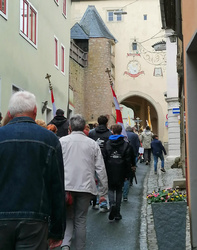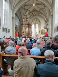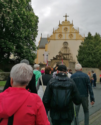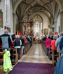Pfarrvikar Nicolas Kehl empfing die Wallfahrer an der Wallfahrtskirche mit Weihwasser und freute sich, mit einer großen Schar von Pilgern den Wallfahrtsgottesdienst gemeinsam mit Pfarrer Jasniewicz und Diakon Kornacker zu feiern. Im Gottesdienst beteiligten sich alle Gemeinden bei den Fürbitten oder der Gabenprozession. So wurde in der gut gefüllten Wallfahrtskirche die Gemeinschaft des pastoralen Raums sichtbar. Im Anschluss daran gab es bei Stängchen und Getränken noch Zeit zum Austausch und Gespräch vor der Kirche und im Wallfahrergang des Franziskanerklosters.