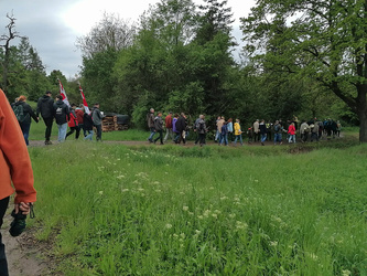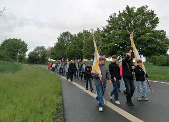 Die Euerfelder trafen sich um 8:15 Uhr an der Kirche und liefen gemeinsam mit den Ministranten und unter der Begleitung der örtlichen Musikkapelle durch Schernau bis zum Spielplatz in Brück. Dort schloss man sich mit den Wallfahrern aus Prosselsheim, Neusetz, Schnepfenbach und Brück zusammen.