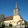 Die älteste Bausubstanz der heutigen Kirche mitten im Ort ist der viergeschossige Turm der Vorgängerkirche mit eingezogenem, quadratischem Chor. 1733 wird das flachgedeckte Langhauses zu drei Fensterachsen erbaut. Die Grundsteinlegung erfolgt am 18.05.1733. Durch Brand eines Nachbargebäudes wird die Kirche 1845 beschädigt. 1930 wird die Sakristei nach Plänen von Josef Steinmüller, Bibergau, an der Chornordseite erbaut. Die Erweiterung der Kirche um fünf Meter in westliche Richtung erfolgt nach Plänen von Gustav Heinzmann, Würzburg, 1960. Eine erneute Erweiterung mit Neubau der Sakristei am nördlichen Langhaus nach Plänen von Walter Väth, Würzburg, wird 1979-1981 vollzogen.